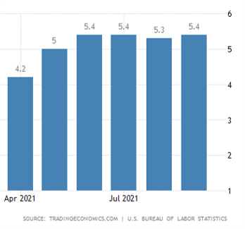 The annual inflation rate in the US edged up to a 13-year high of 5.4% in September of 2021 from 5.3% in August.