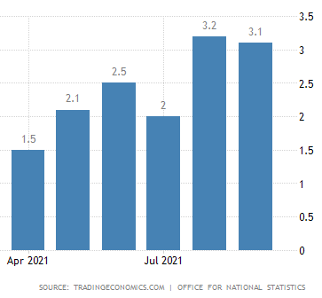 The annual inflation rate in the UK edged down to 3.1% in September of 2021 from a 9-year high of 3.2% in August and below forecasts of 3.2%.