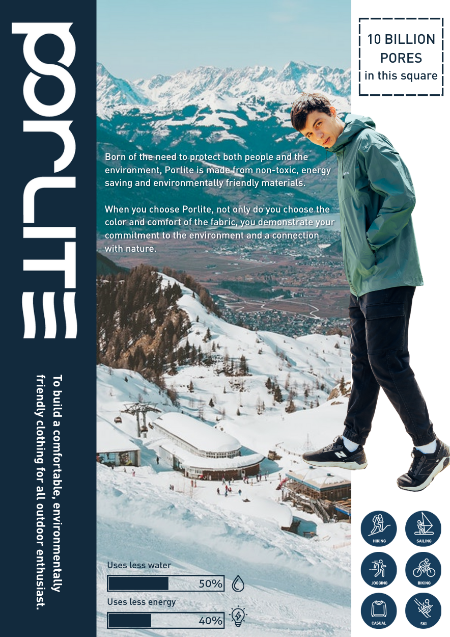 Porlite, the green processes fabrics with excellent breathability and waterproof performance. The highest level of the moisture-permeable and breathable membrane is not only suitable for outdoor activities but also suitable for aerobic exercise.